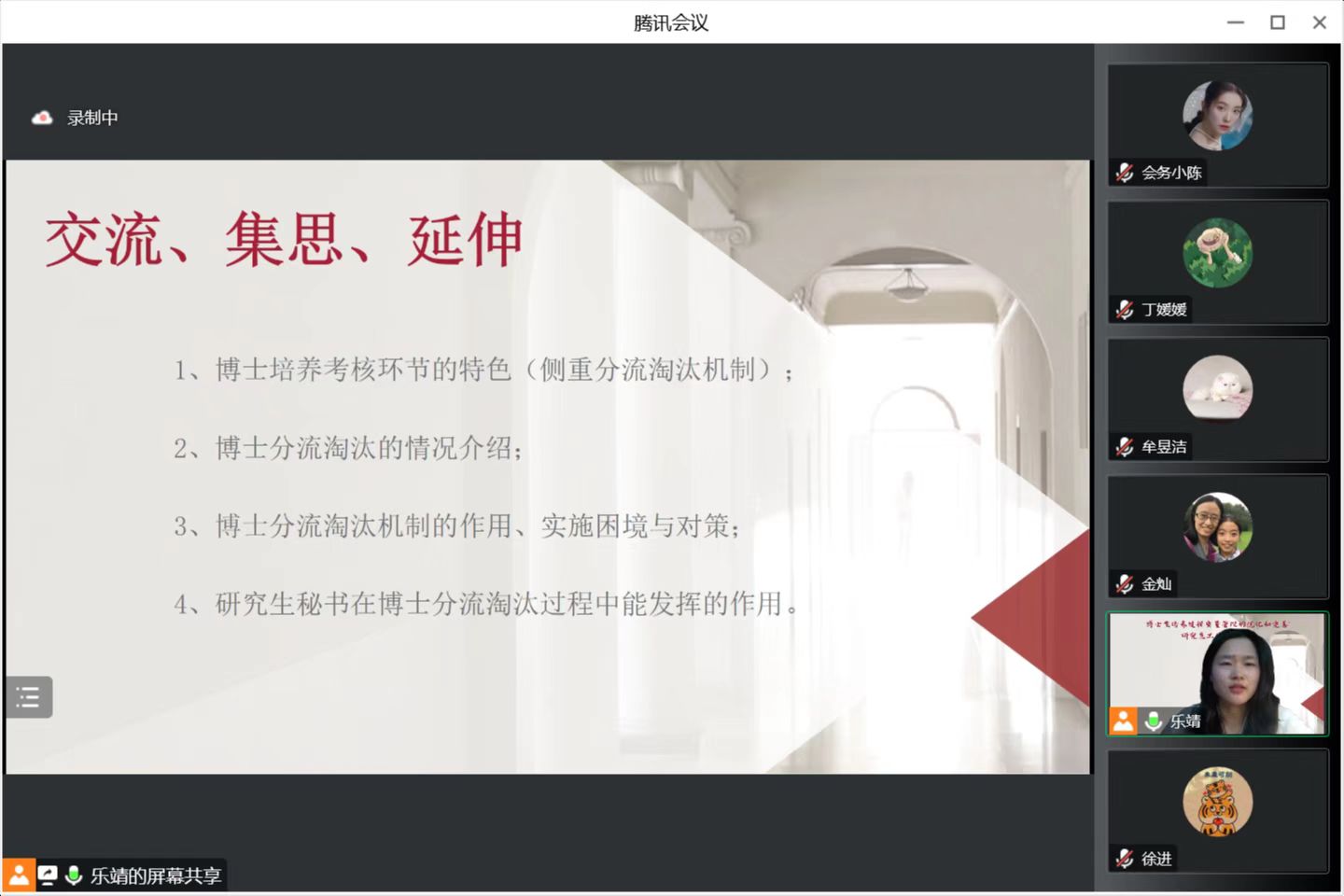 博士研究生是我国经济社会转型的重要推动力量。随着我国产业转型升级和社会经济的快速发展,社会对高质量人才、领军人才的需求更加迫切。为推进博士生教育高质量发展,健全博士生培养质量管理体系,以“博士生培养过程质量管理的优化和完善——博士生分流淘汰机制的实施困境与对策”为主题的研究生工作秘书沙龙于2022年10月21日以腾讯线上会议形式成功举行。河口海岸研究院研究生工作秘书金灿、生态与环境科学学院研究生工作秘书丁媛媛作主要分享,研究生培养办公室崔光秀及来自不同院系的研究工作秘书等10位老师参加研讨会。会议由政治与国际关系学院研究生工作秘书乐靖主持。