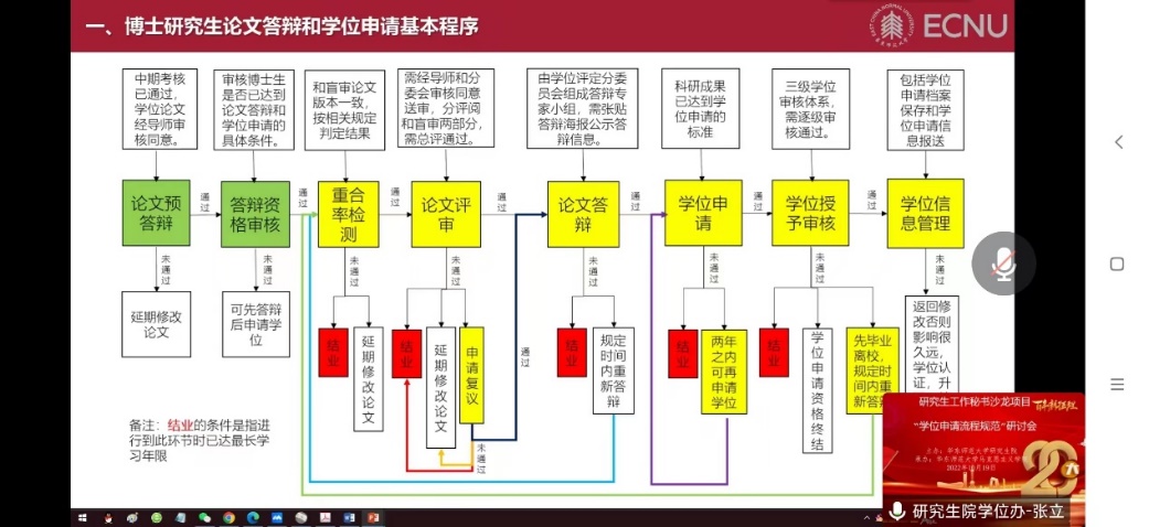 张立介绍了博士学位申请的一般流程,以流程图的形式细致地讲解关键节点,强调以重合率检测环节为起点的有关学位申请的处理办法与要求,并着重说明严格规范答辩程序和分委会程序的重要性。