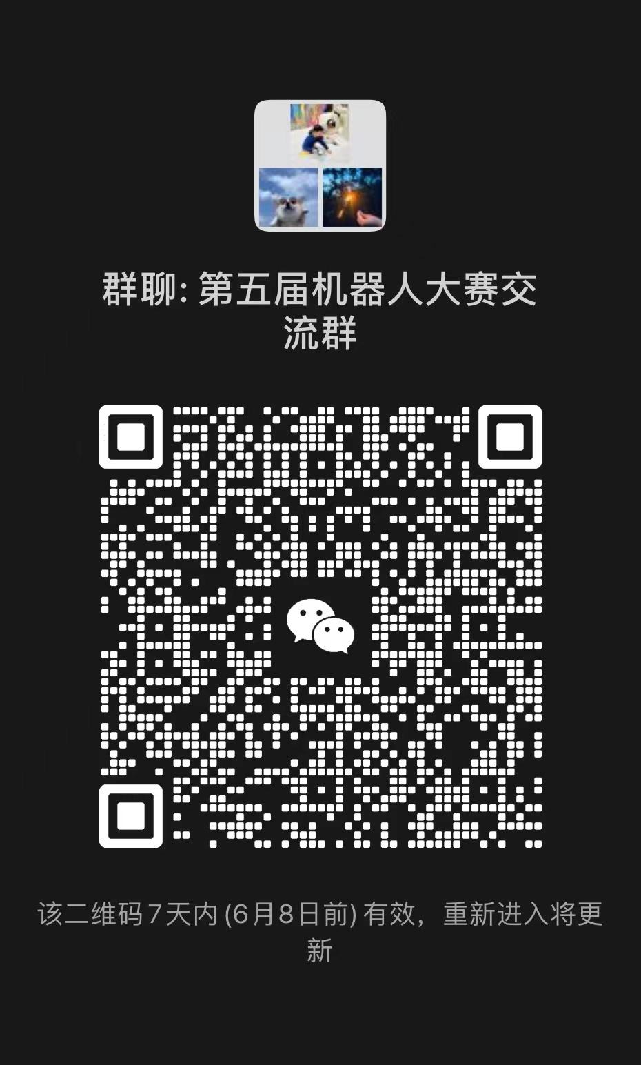2.交流咨询:请参赛队员扫码(见下附件4),加入微信工作群,跟进大赛流程、讲座培训以及交流咨询。进群后,注明“院系+姓名+机器人参赛”。